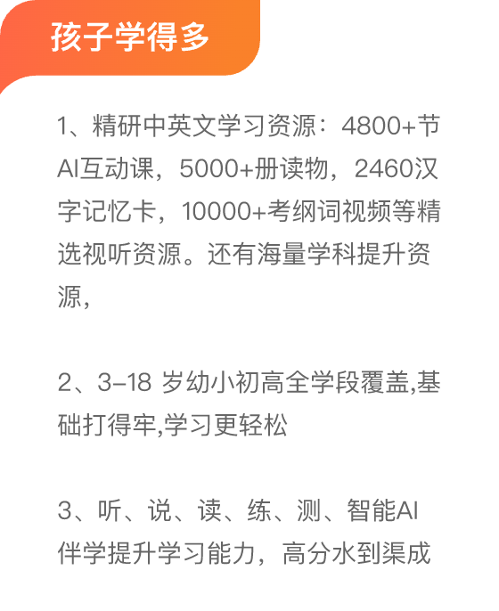 - 泛读:5000+AI英语读物,各种主题绘本,故事类与非故事类(如科普)结合,拓展阅读量,开拓孩子视野。